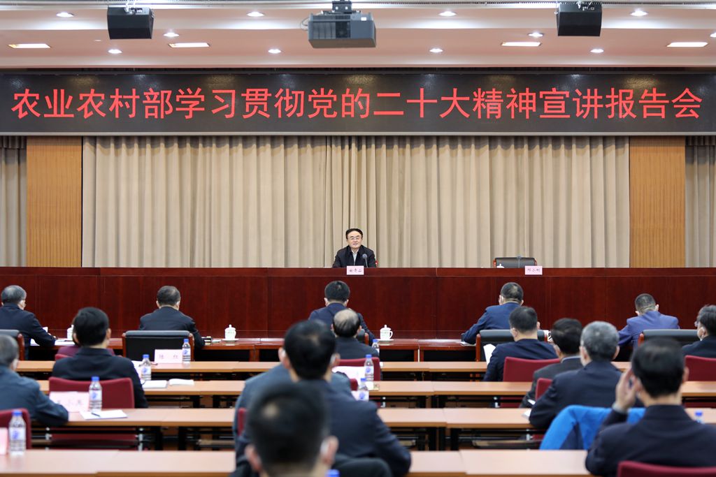 1月10日,農(nóng)業(yè)農(nóng)村部舉辦學習貫徹黨的二十大精神宣講報告會,邀請中央宣講團成員、中央黨史和文獻研究院院長曲青山為部系統(tǒng)黨員干部作宣講報告。農(nóng)業(yè)農(nóng)村部黨組成員、副部長鄧小剛主持報告會。