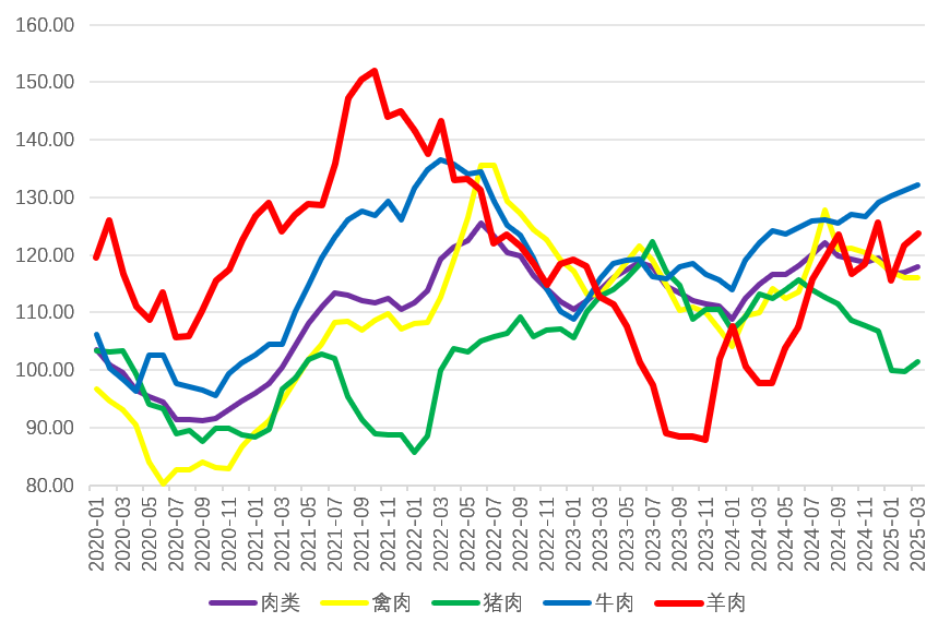 2025年3月份,FAO肉類價格指數小幅上漲,其中,豬肉、牛肉、羊肉價格上漲,禽肉價格微幅下跌。FAO肉類價格指數(基期為2014—2016年)2024年1月份降至108.86后反彈,最高漲至8月份122.02,2025年3月份為118.01,環比漲0.9%,同比漲2.7%。