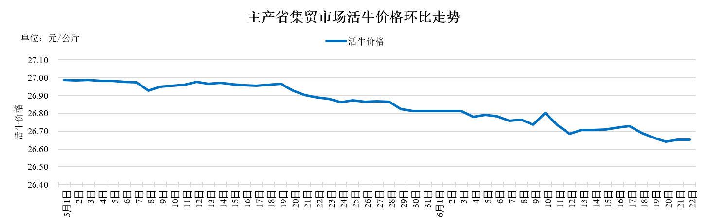 據農業農村部監測,2025年6月22日,主產省集貿市場活牛價格每公斤26.65元,同比上漲13.1%,環比持平。