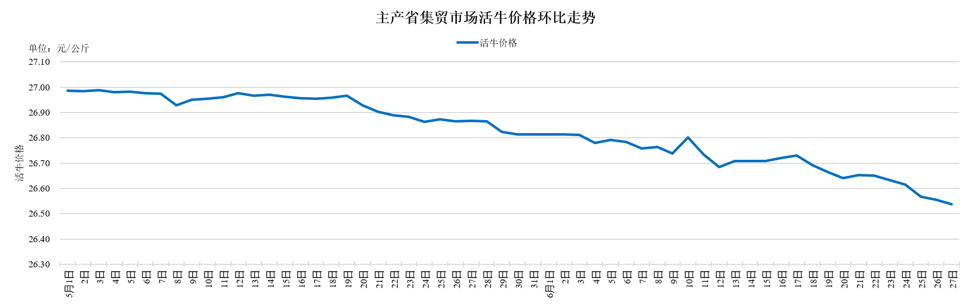 據(jù)農(nóng)業(yè)農(nóng)村部監(jiān)測(cè),2025年6月27日,主產(chǎn)省集貿(mào)市場(chǎng)活牛價(jià)格每公斤26.54元,同比上漲12.5%,環(huán)比下跌0.1%。