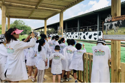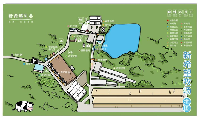 牧場以“探鮮”為主題,劃分展示區、科普區、互動區、休閑區等,開展科普宣傳、鮮奶品嘗、兒童DIY制作等項目,設有希望大門、時光灣、希望廊橋、希望奶源、犢牛島、食育課堂等6大打卡站點,結合奶牛生活習性、牛奶產出過程、鄉野田園特色,打造漫畫式、沉浸式場景,讓游客身臨其境體驗原生態牧場,探究新希望牛奶“鮮”之奧秘。牧場主要面向3~12歲幼小學生開展親子游、研學游等,以預約參觀模式經營。日接待能力500余人。距成都網紅打卡地“我的田園·自然王國”10公里,距“洛帶古鎮”18公里。