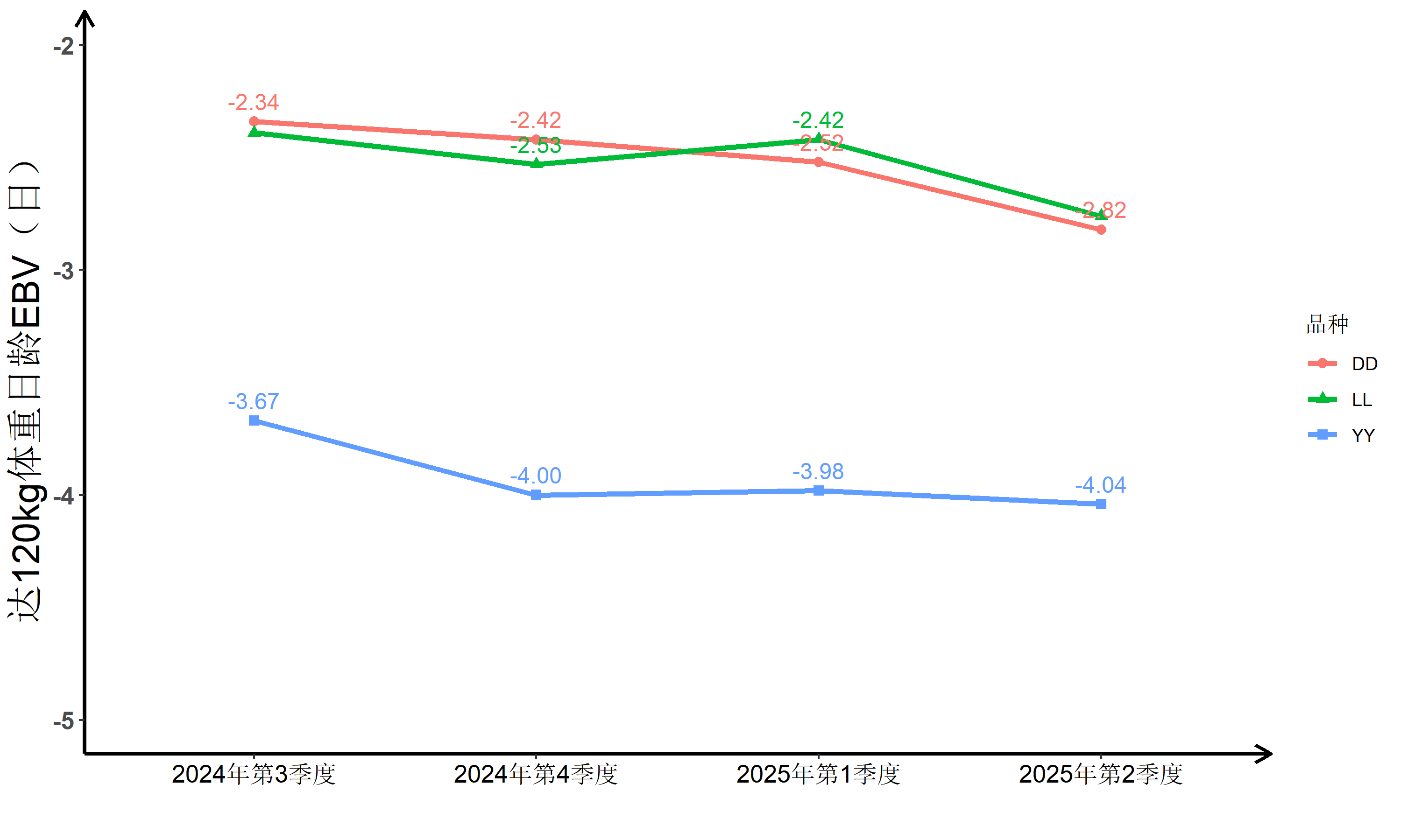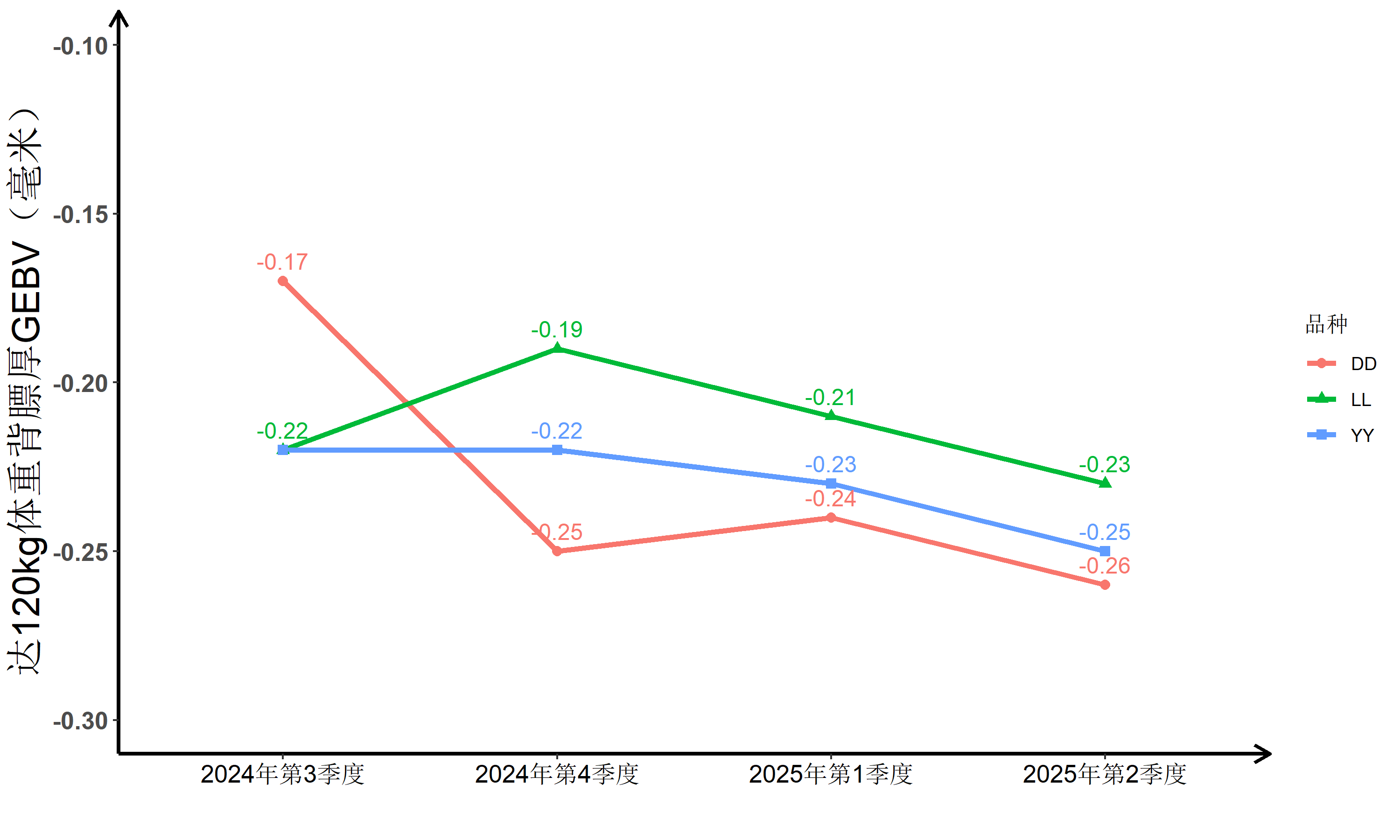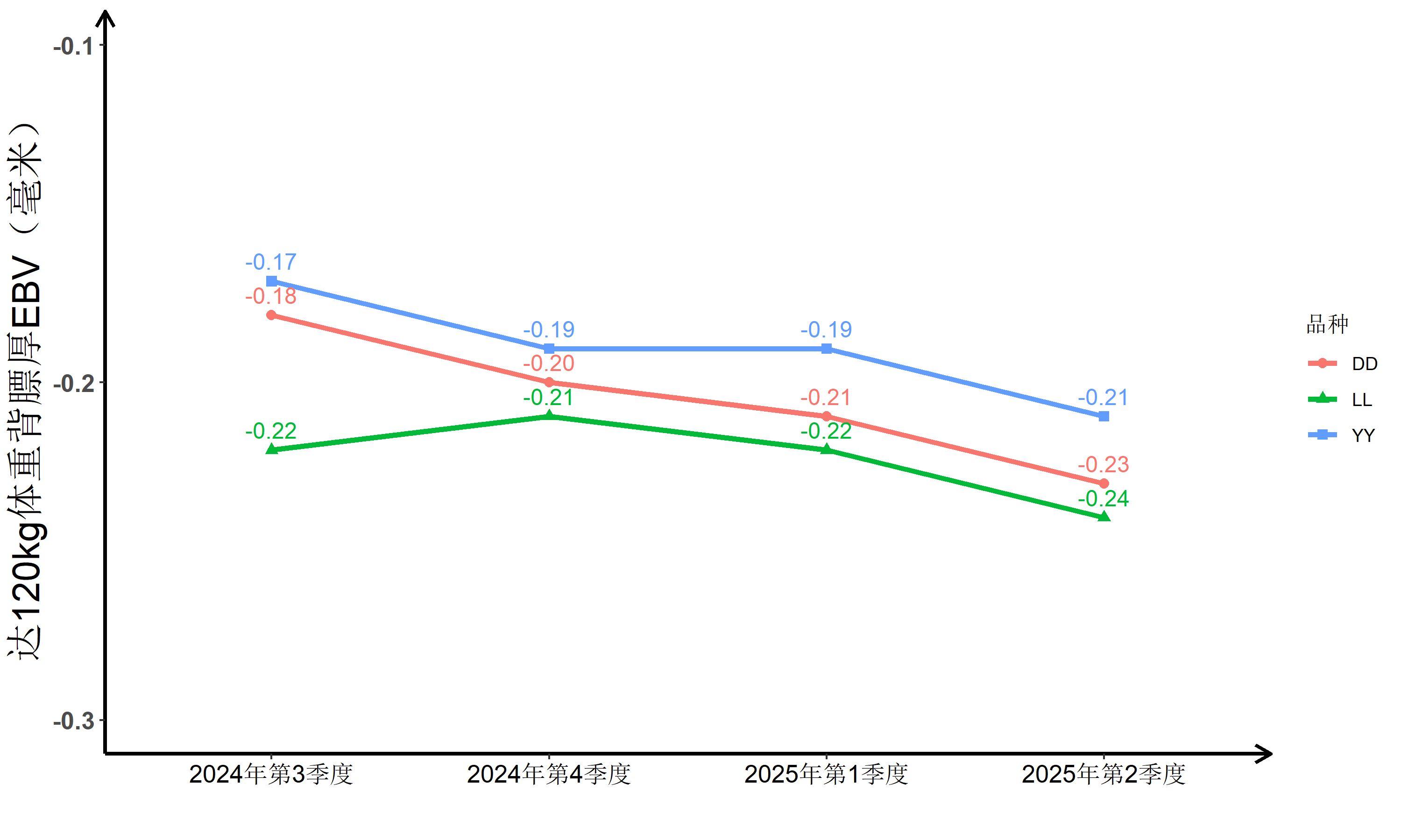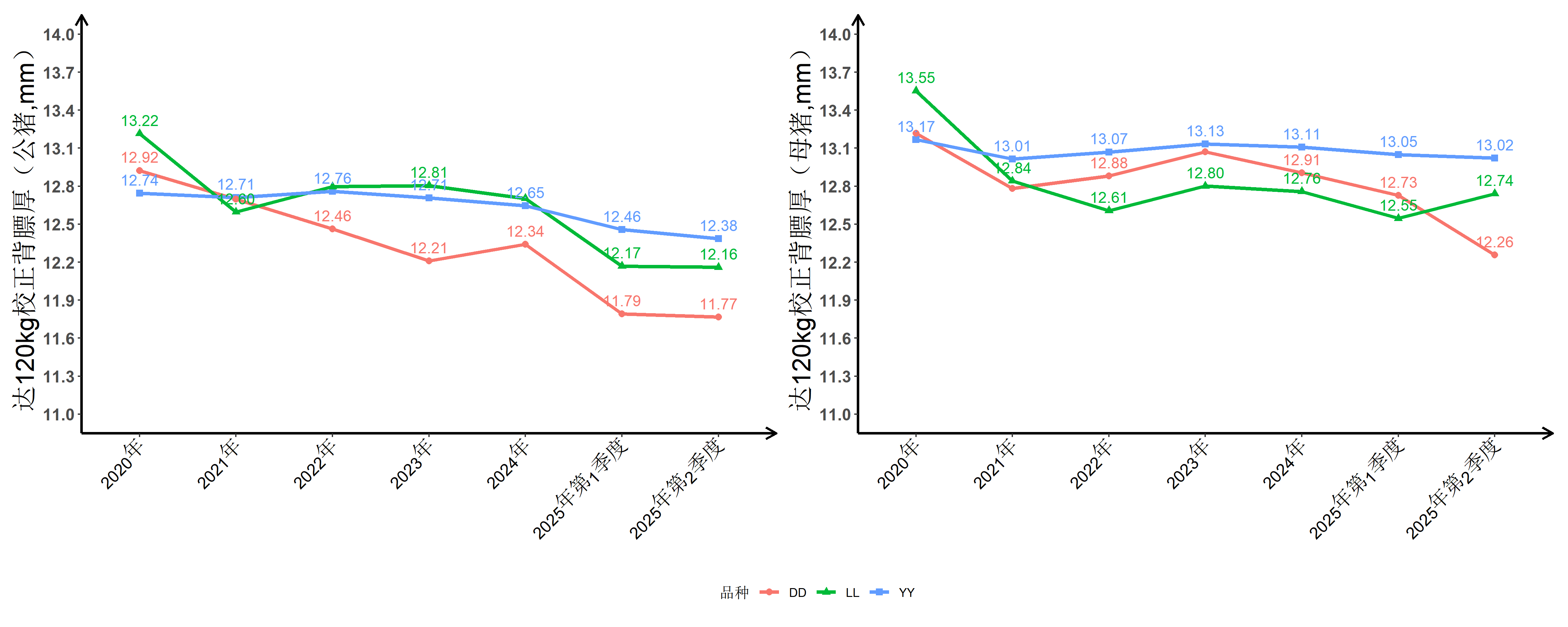 本部分對所有核心場符合數(shù)據(jù)遴選標準的種豬進行了表型進展分析。統(tǒng)計分析了大白豬、長白豬、杜洛克三個品種從2020年到2025年第二季度的全國平均表型進展。