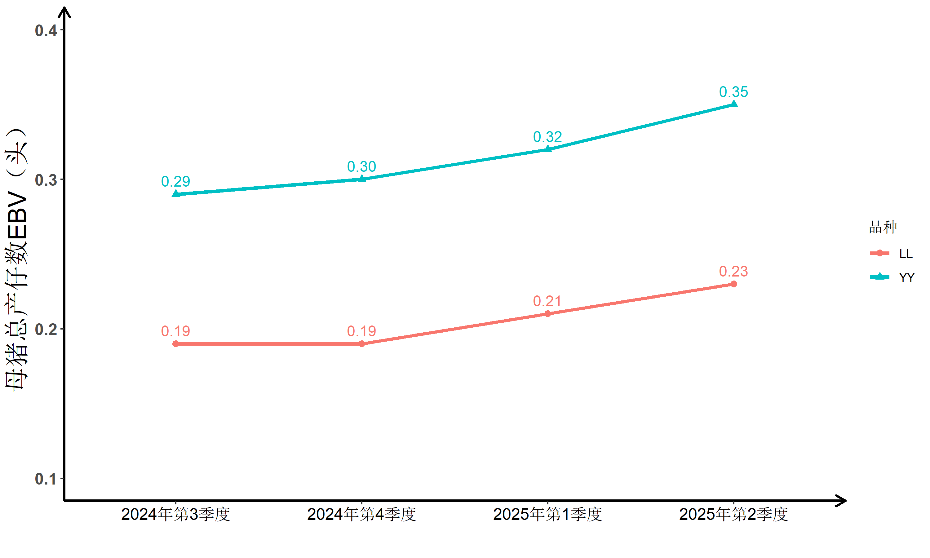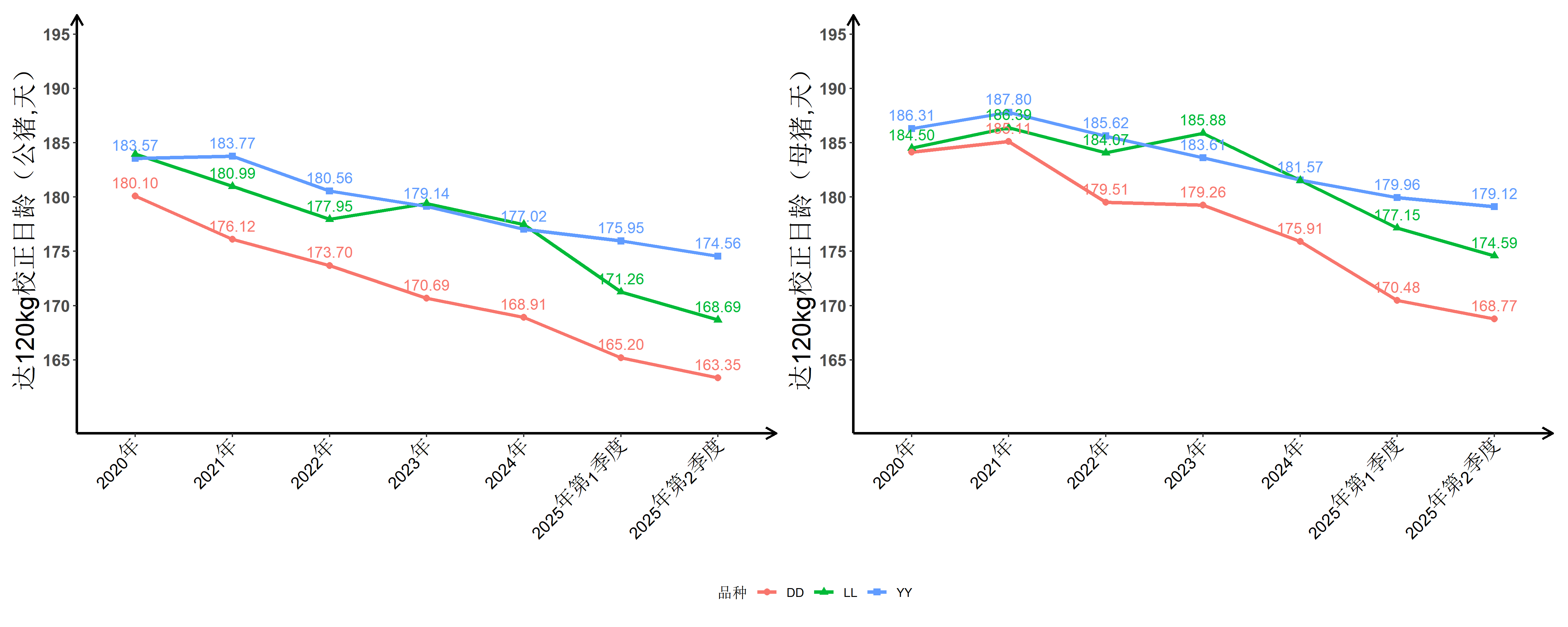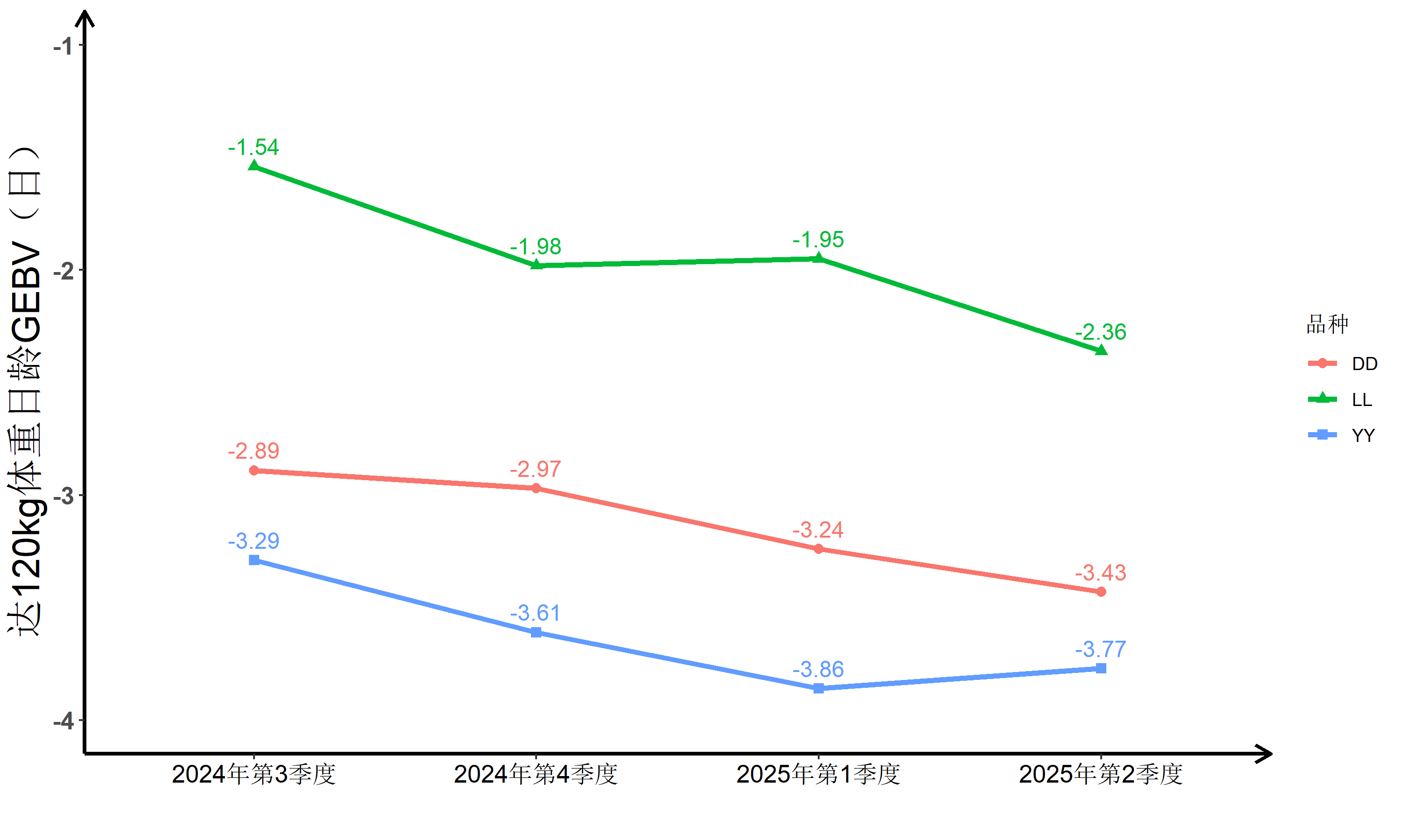 本部分對所有核心場符合數(shù)據(jù)遴選標準的種豬進行了表型進展分析。統(tǒng)計分析了大白豬、長白豬、杜洛克三個品種從2020年到2025年第二季度的全國平均表型進展。