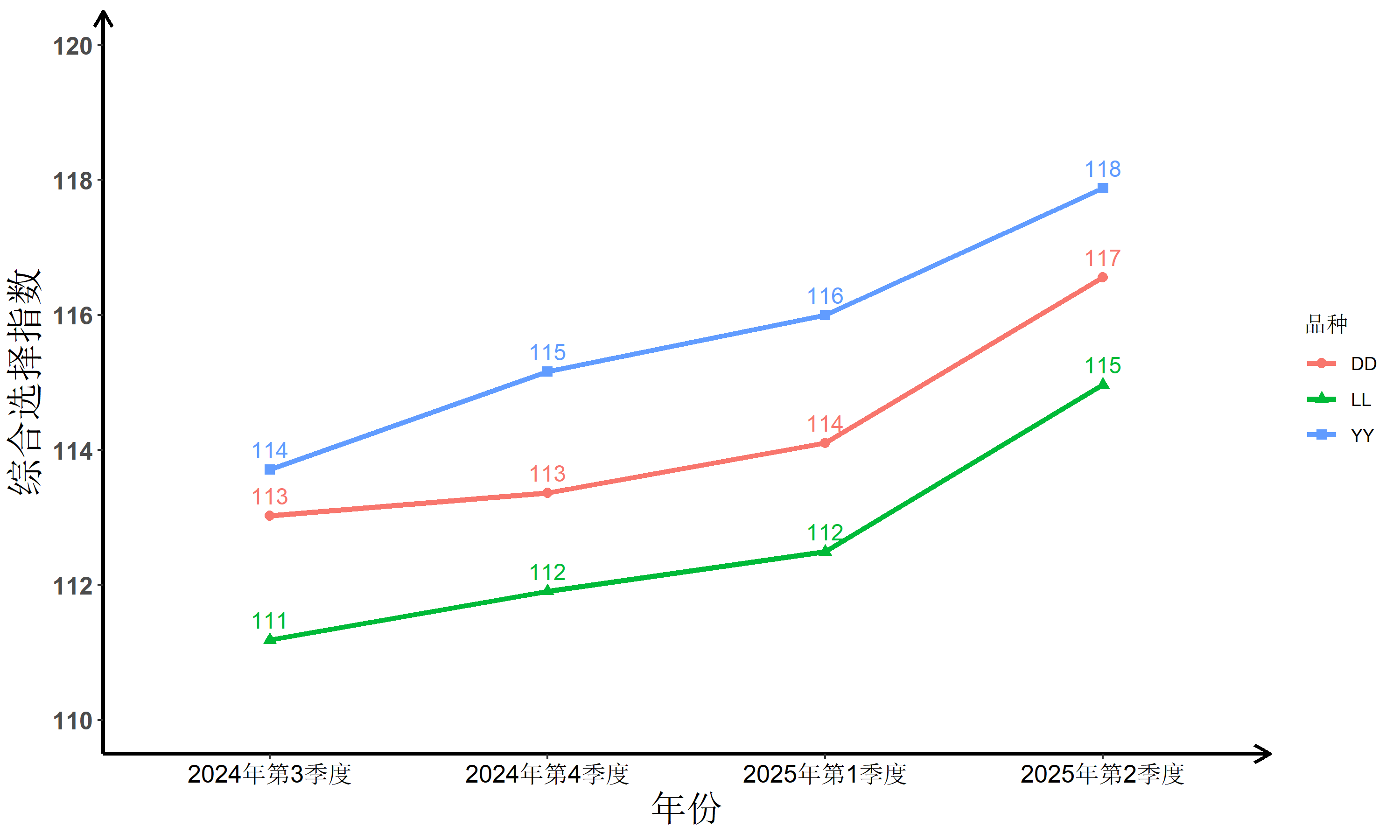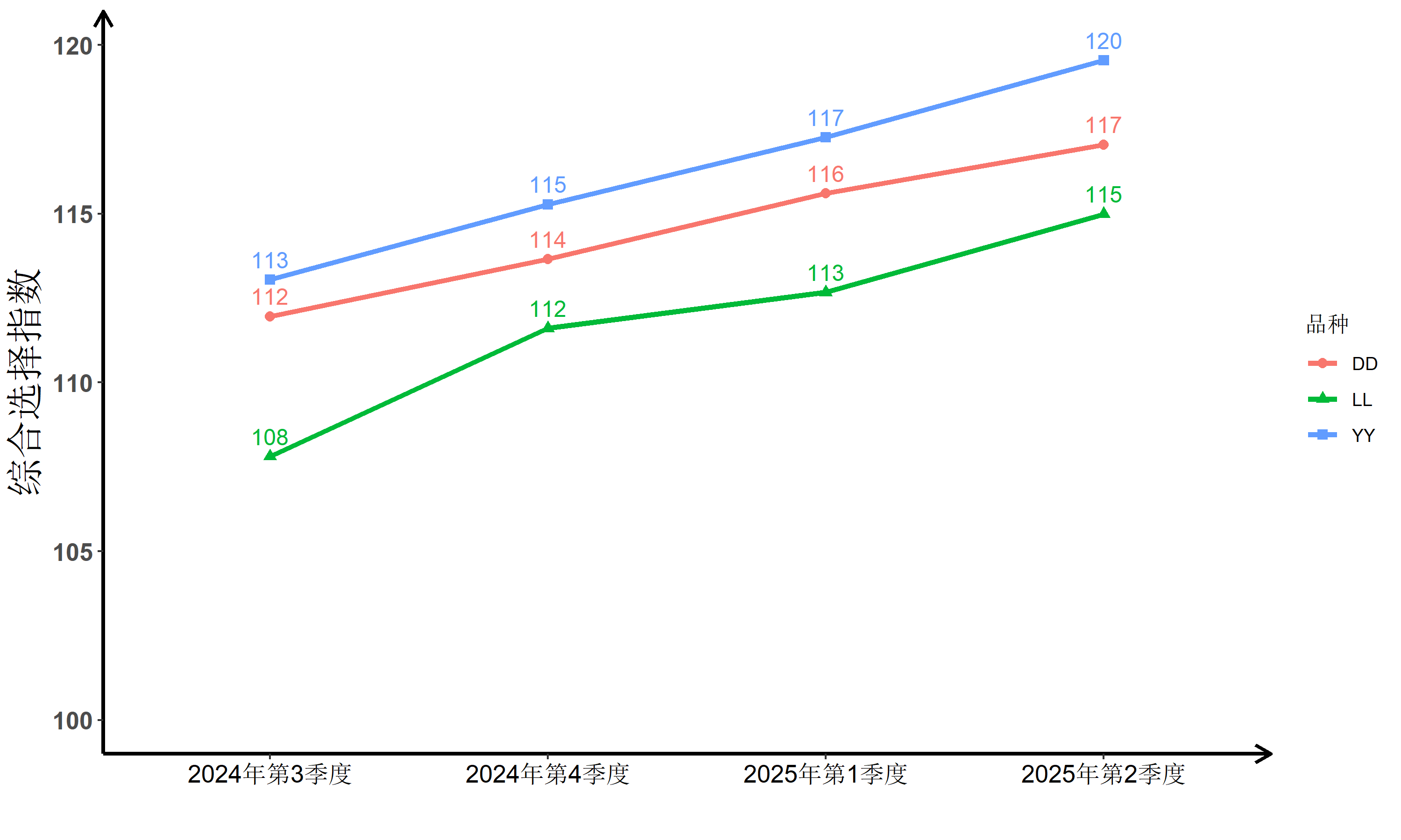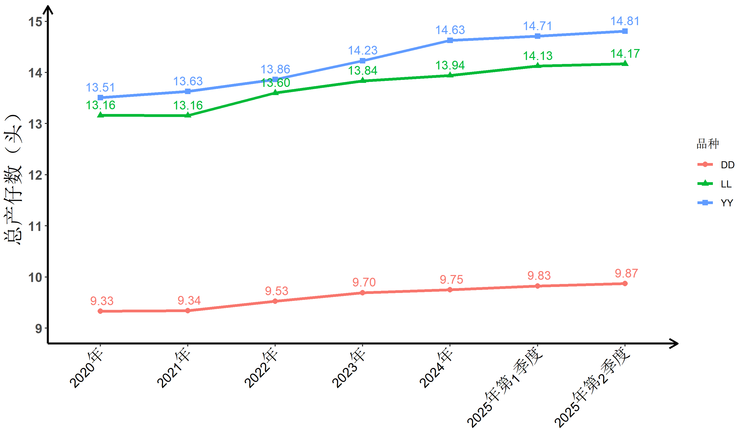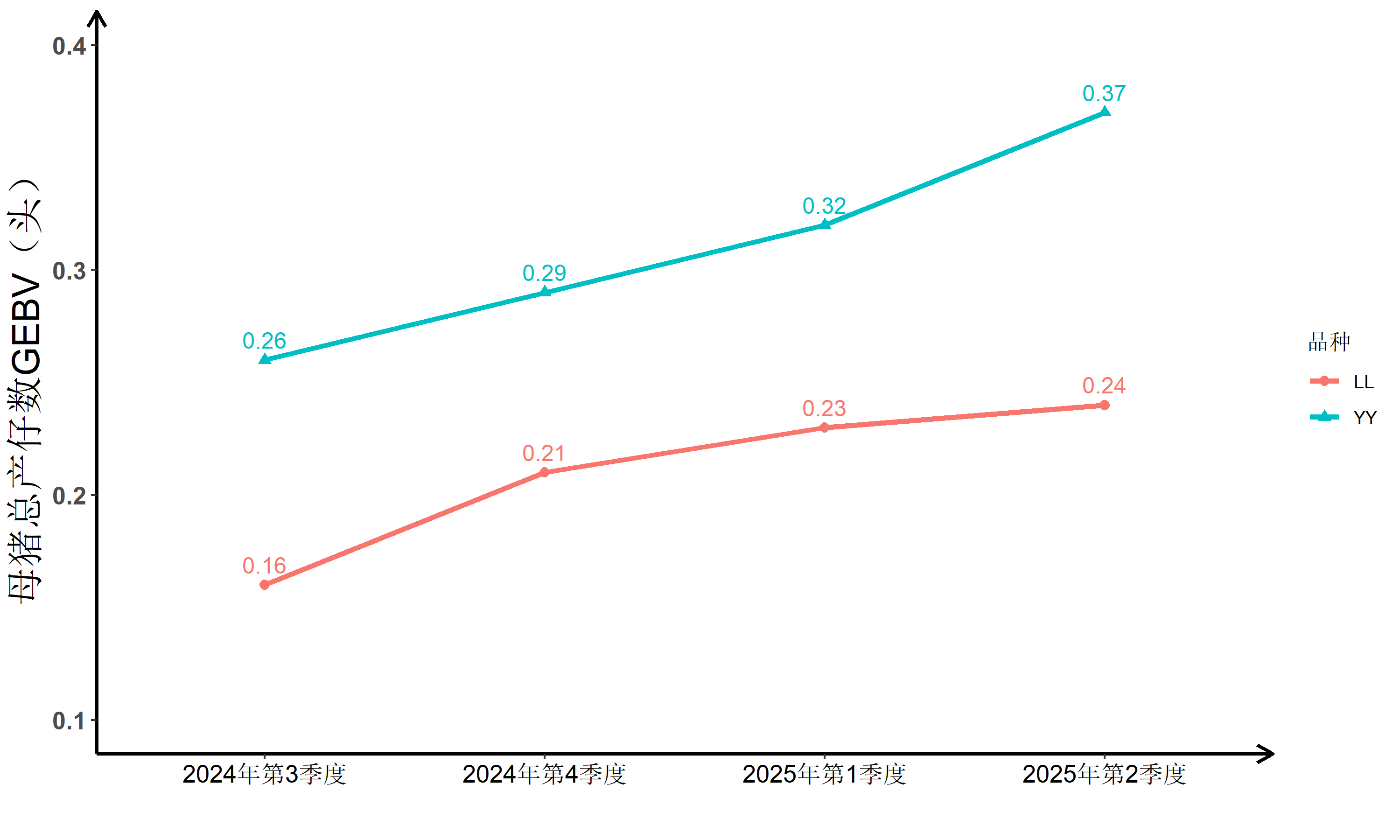 本部分對所有核心場符合數(shù)據(jù)遴選標準的種豬進行了表型進展分析。統(tǒng)計分析了大白豬、長白豬、杜洛克三個品種從2020年到2025年第二季度的全國平均表型進展。