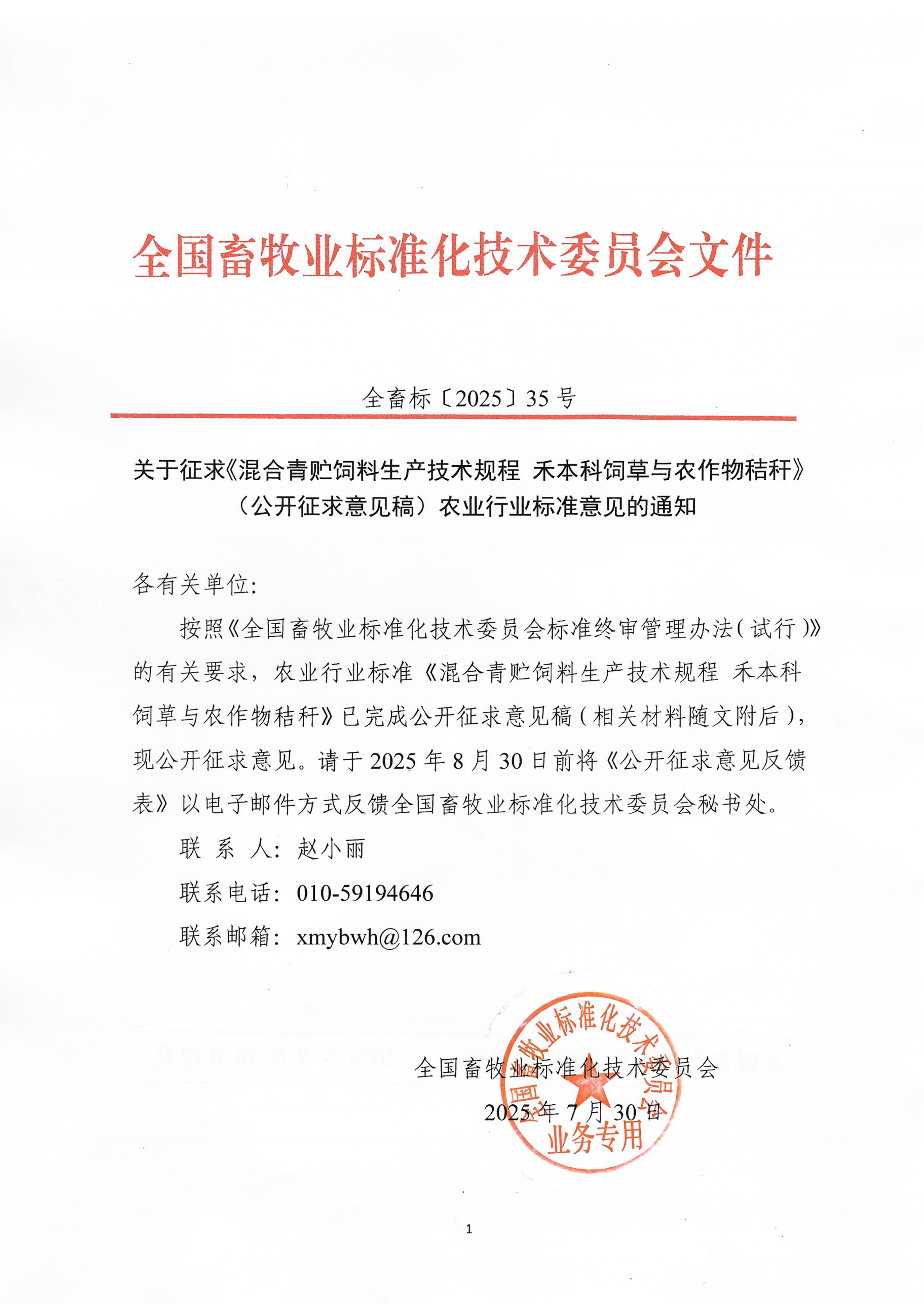 關于征求《混合青貯飼料生產技術規程 禾本科飼草與農作物秸稈》(公開征求意見稿)農業行業標準意見的通知