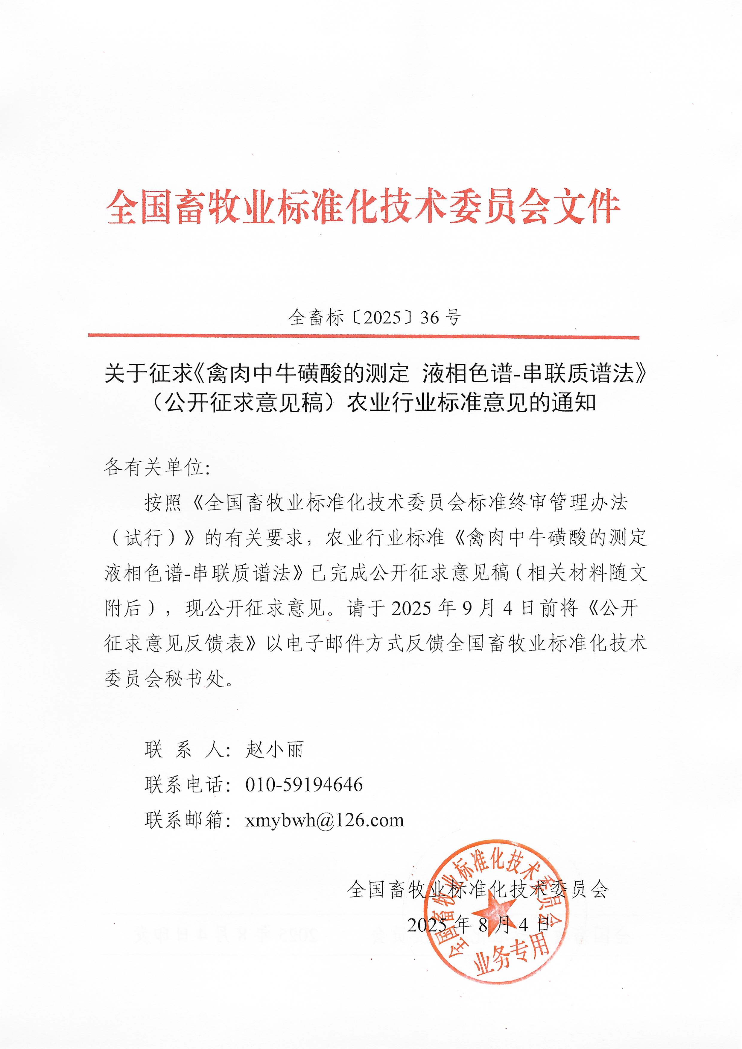 關于征求《禽肉中?;撬岬臏y定 液相色譜-串聯質譜法》(公開征求意見稿)農業行業標準意見的通知