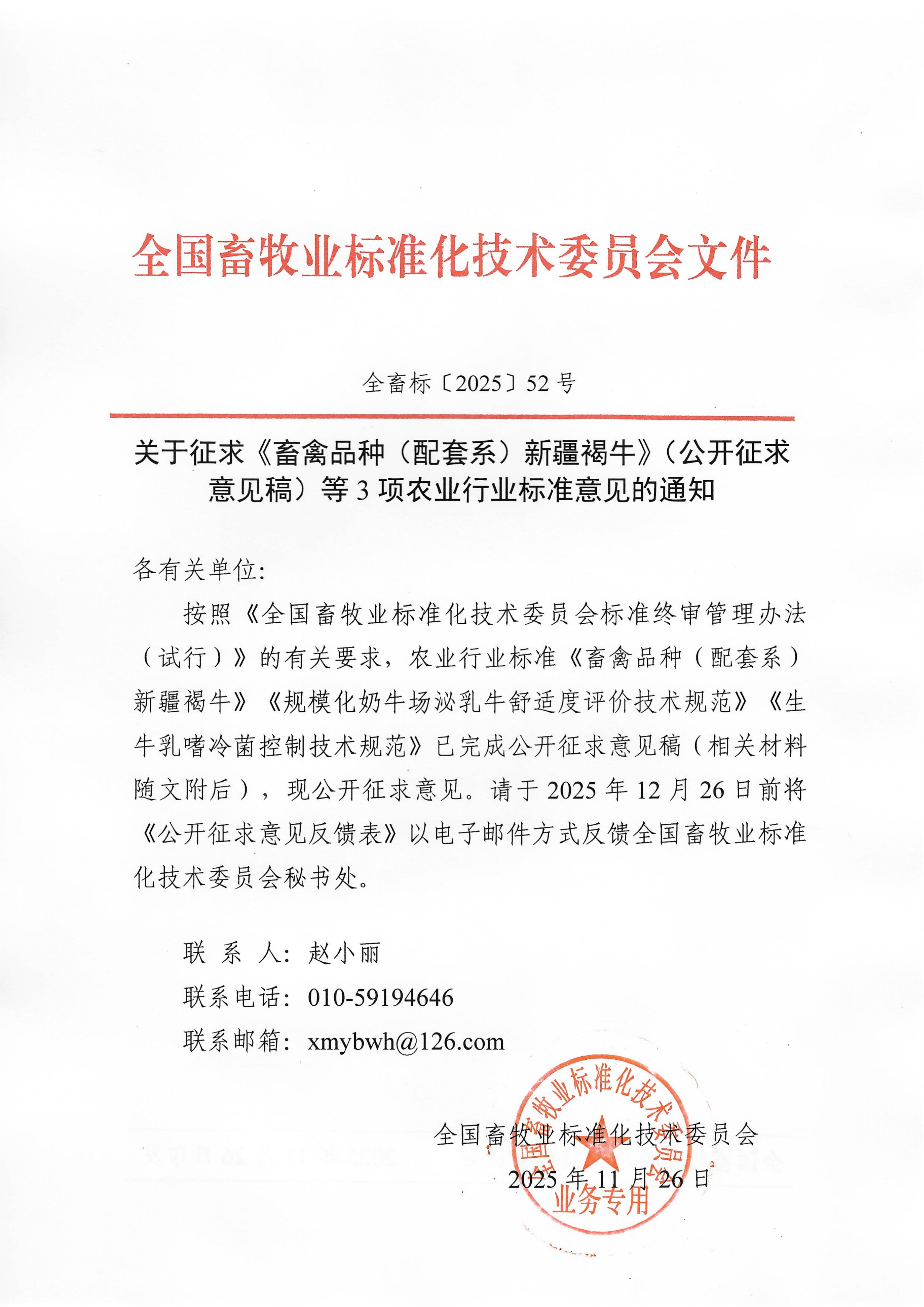 關于征求《畜禽品種(配套系)新疆褐牛》(公開征求意見稿)等3項農業行業標準意見的通知