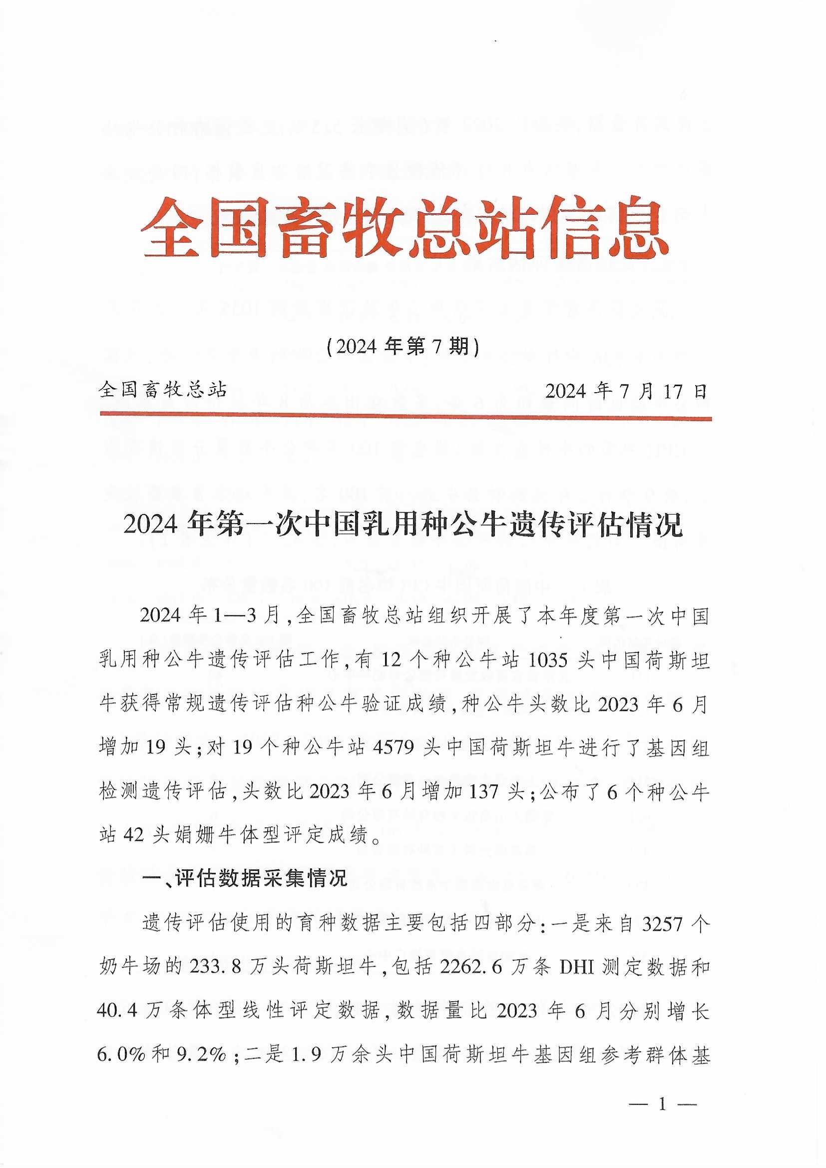 全國畜牧總站信息(2024年第7期)-2024年第一次中國乳用種公牛遺傳評估情況